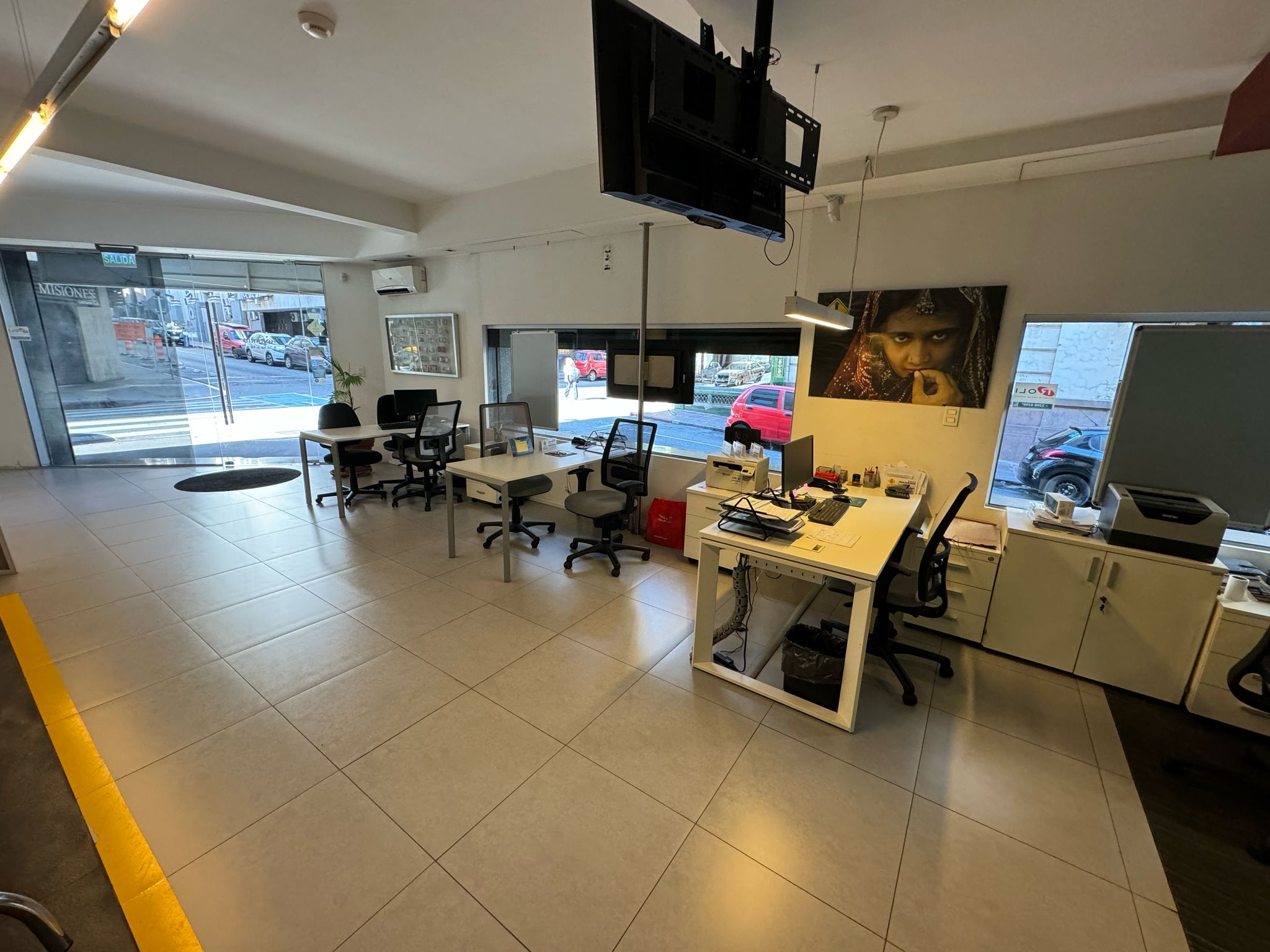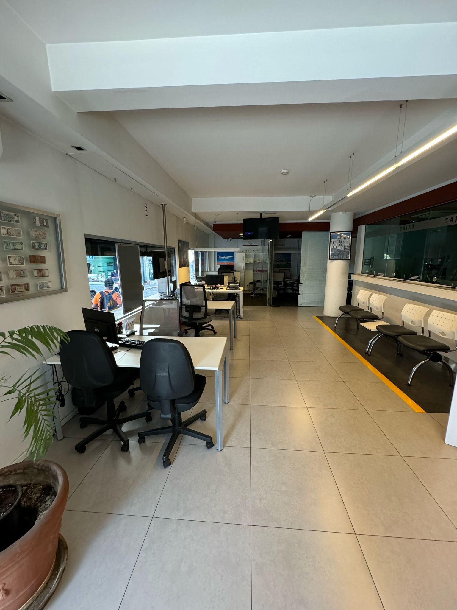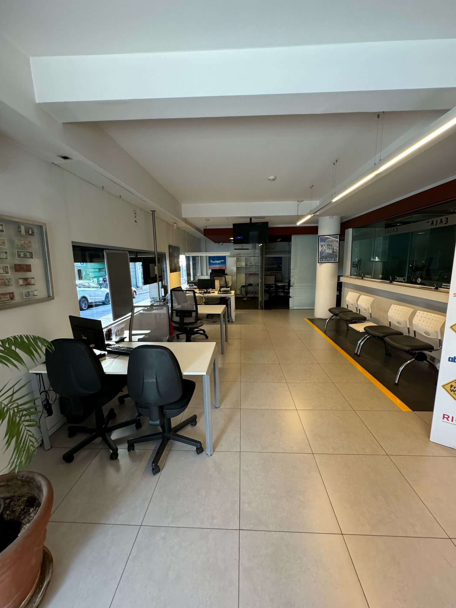 Planta principal: amplio salón de atención al público (14 m x más de 4,75 m), 4 cajas instaladas, 2 oficinas privadas, sala de reuniones, cocina definida y baño reciclado. Excelente circulación y capacidad operativa.
